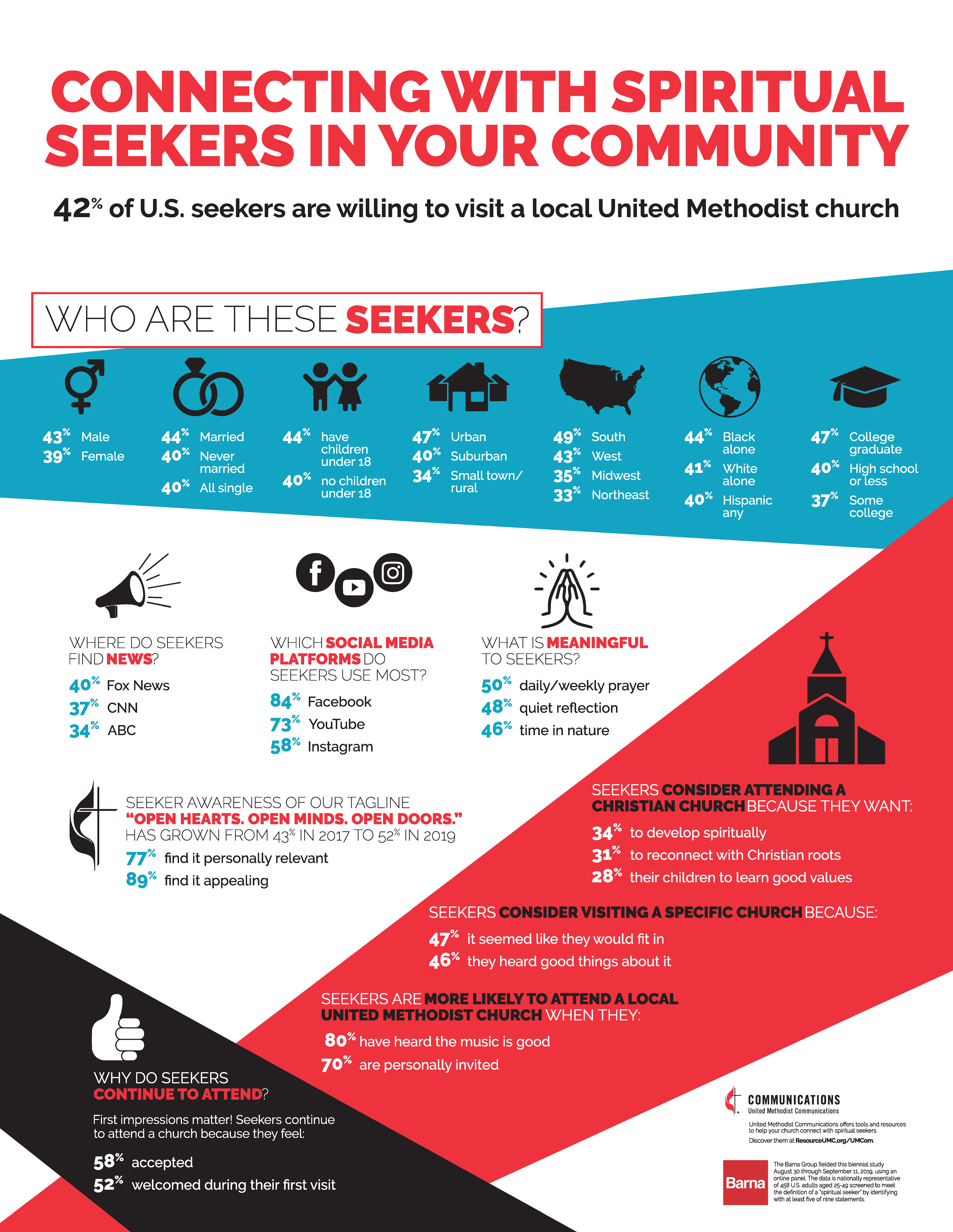 A survey of U.S. spiritual “seekers” ages 25-49, conducted by Barna Group on behalf of United Methodist Communications found willingness to visit a United Methodist Church rose to 42 percent in 2019 among U.S. adults seeking more spirituality in their lives and who are aware of the denomination. That's up from 28 percent in 2017. Other findings include: