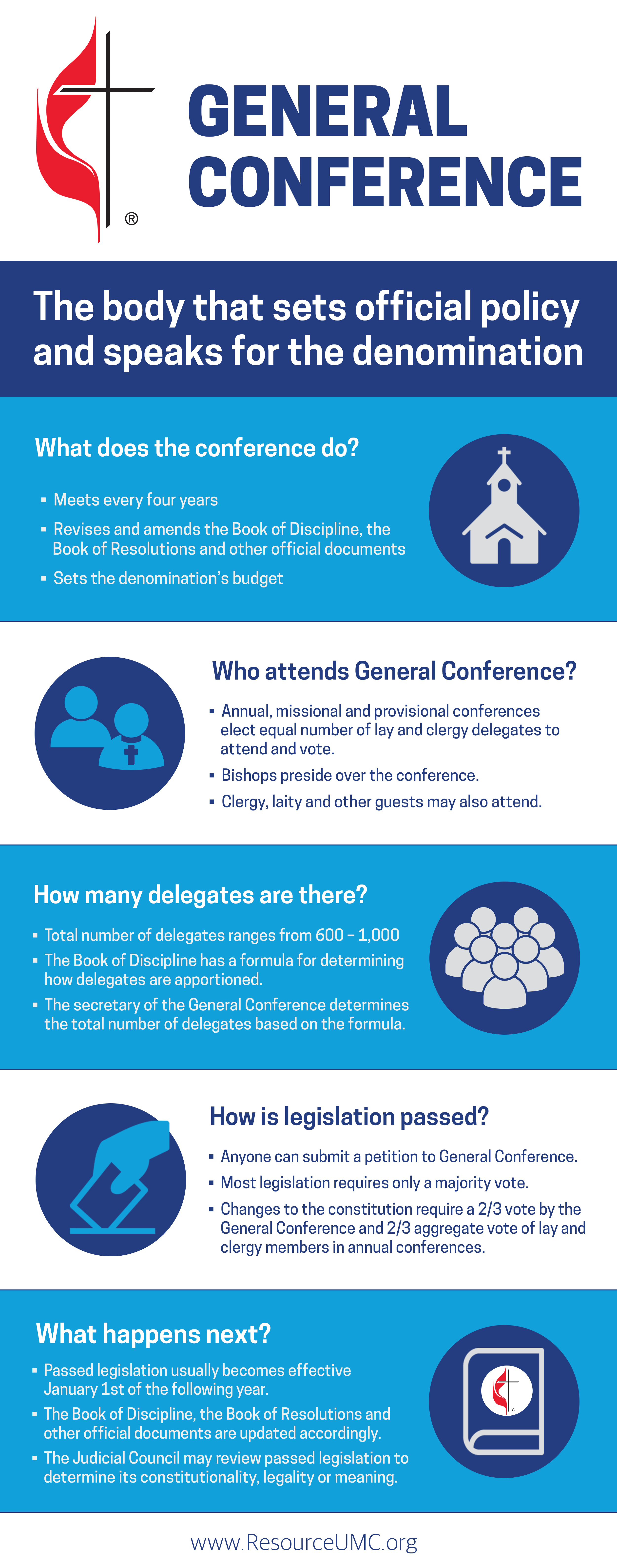 As the highest legislative body of The United Methodist Church, General Conference holds the power to revise The Book of Discipline and The Book of Resolutions while also initiating amendments to the denominations constitution. General Conference normally meets once every quadrennium or every four years. The Council of Bishops may also call a special session to address a specific topic. Only two special sessions have been called since The United Methodist Church formed in 1968.