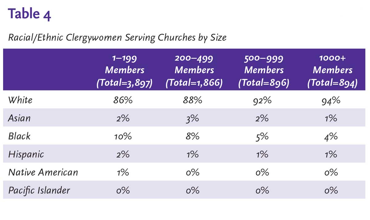 Clergywomen, according to the percentages, serve equally in the various church sizes. Table 3 shows that one-quarter of each of the four church sizes is served by clergywomen. However, the numbers drop precipitously for racial/ethnic clergywomen. Fourteen percent (14%) of small churches (1–199 members) are served by racial/ethnic clergywomen, but that is as good as it gets for racial/ethnic clergywomen. Although 30% of churches with 1,000 or more members are served by clergywomen, only 6% of churches with 1,000 or more members is served by racial/ethnic clergywomen (see Table 4).