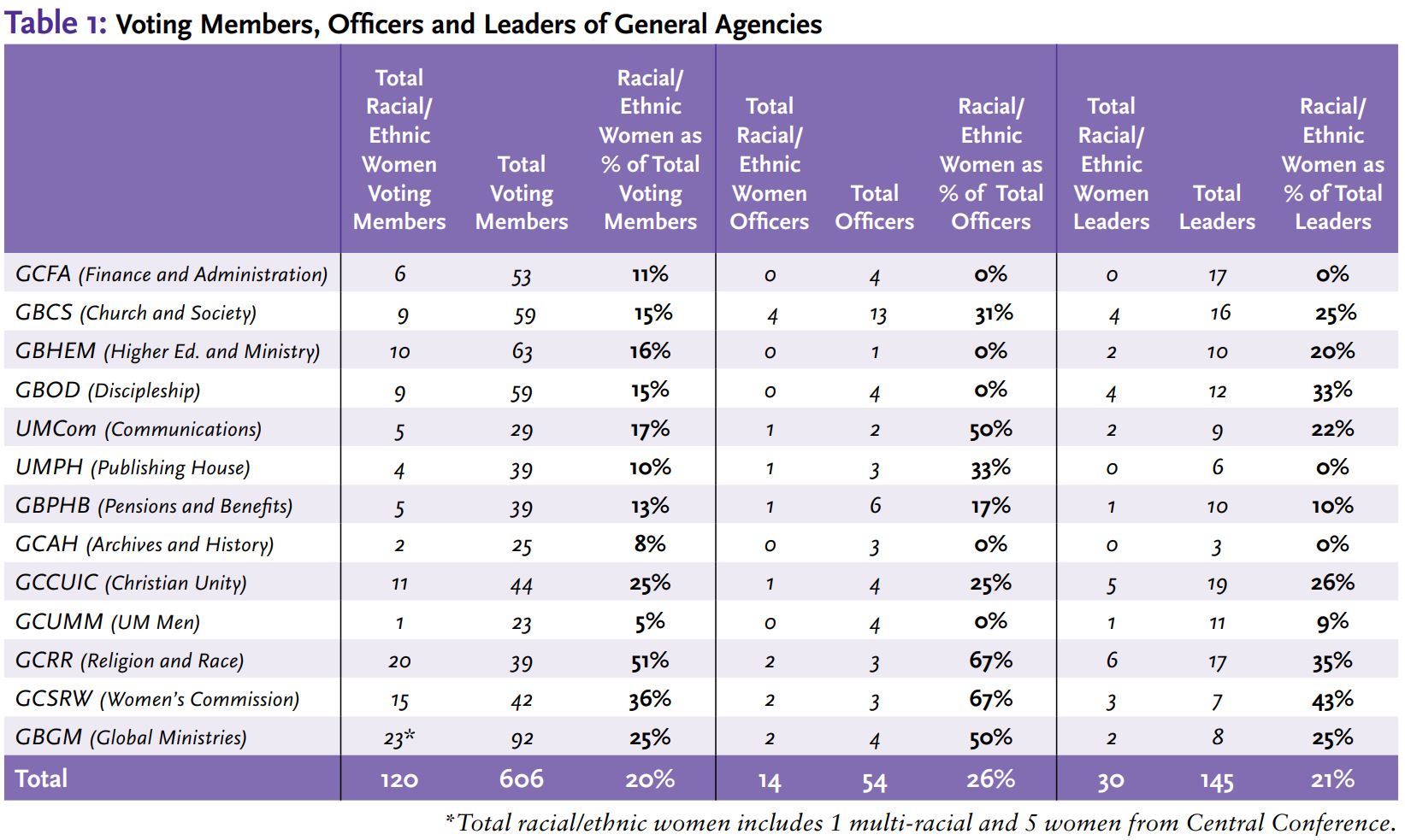 (The Connectional Table, not a general agency, is a group that brings together bishops, staff executives and presidents of general agencies, and representatives from caucuses and conferences from around the world to help guide the mission and ministries of the church. Currently it has 18% racial/ethnic women on its board. See Table 2 for more details.)