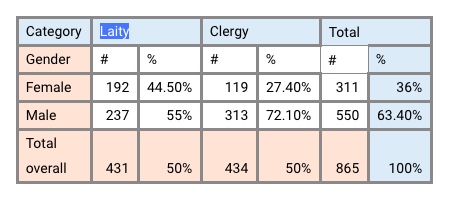 • Of the 550 male delegates, 237 (43%) are laity and 313 (57%) are clergy