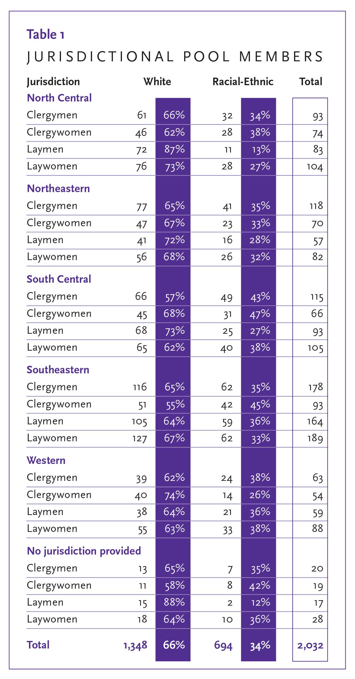 Racial-ethnic women, lay and clergy, comprised 17%, or 350, of the total jurisdictional pool, and 36% of the total number of women in the jurisdictional pool (see Table 1).