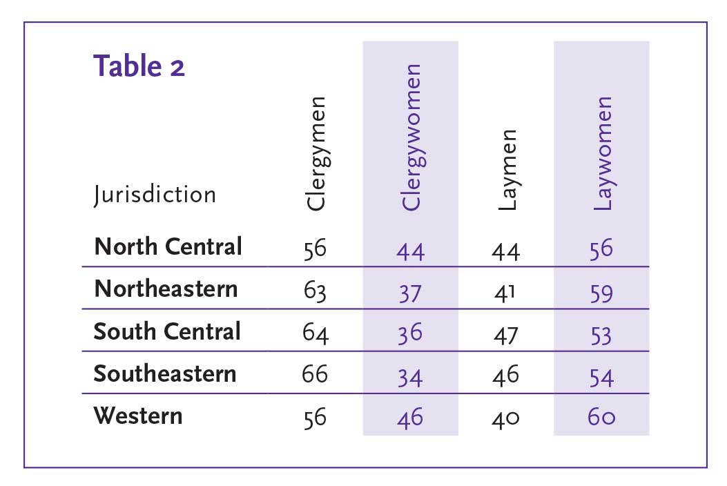 The split along lay and clergy lines also generally reflects the overall jurisdictional percentages. The Western Jurisdiction has the largest percentage of laywomen at 60%, followed closely by Northeastern at 59%. The Southeastern Jurisdiction has the smallest percentage of clergywomen at 34% (see Table 2).