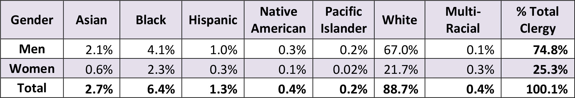 As the December “Women by the Numbers” article stated, women made up about 25% of our active and retired clergy in 2011. Adding racial-ethnic background to the numbers, we can see that white men made up 67% of our clergy, white women made up almost 22%, men of color made up less than 8% and women of color made up less than 4%.