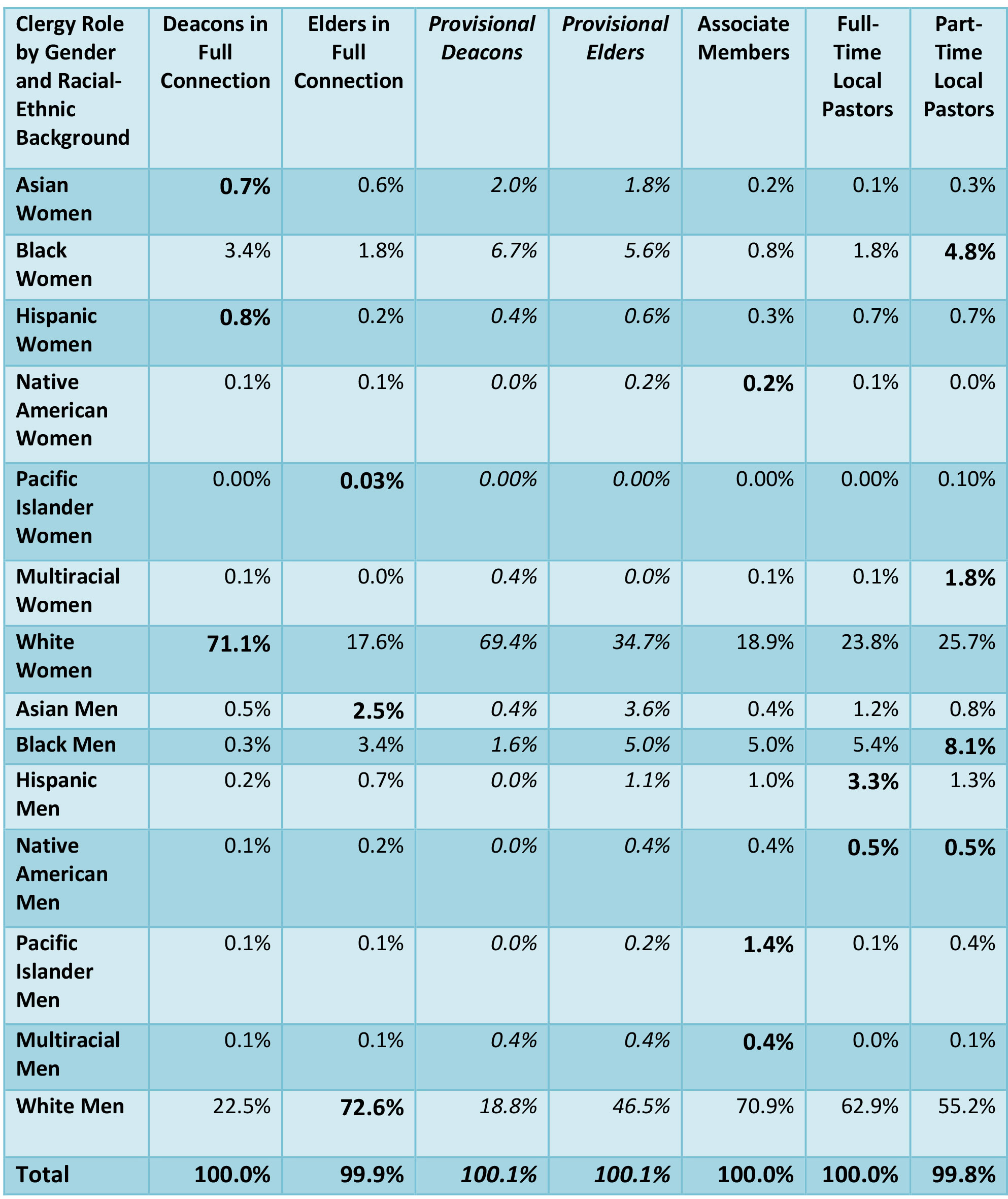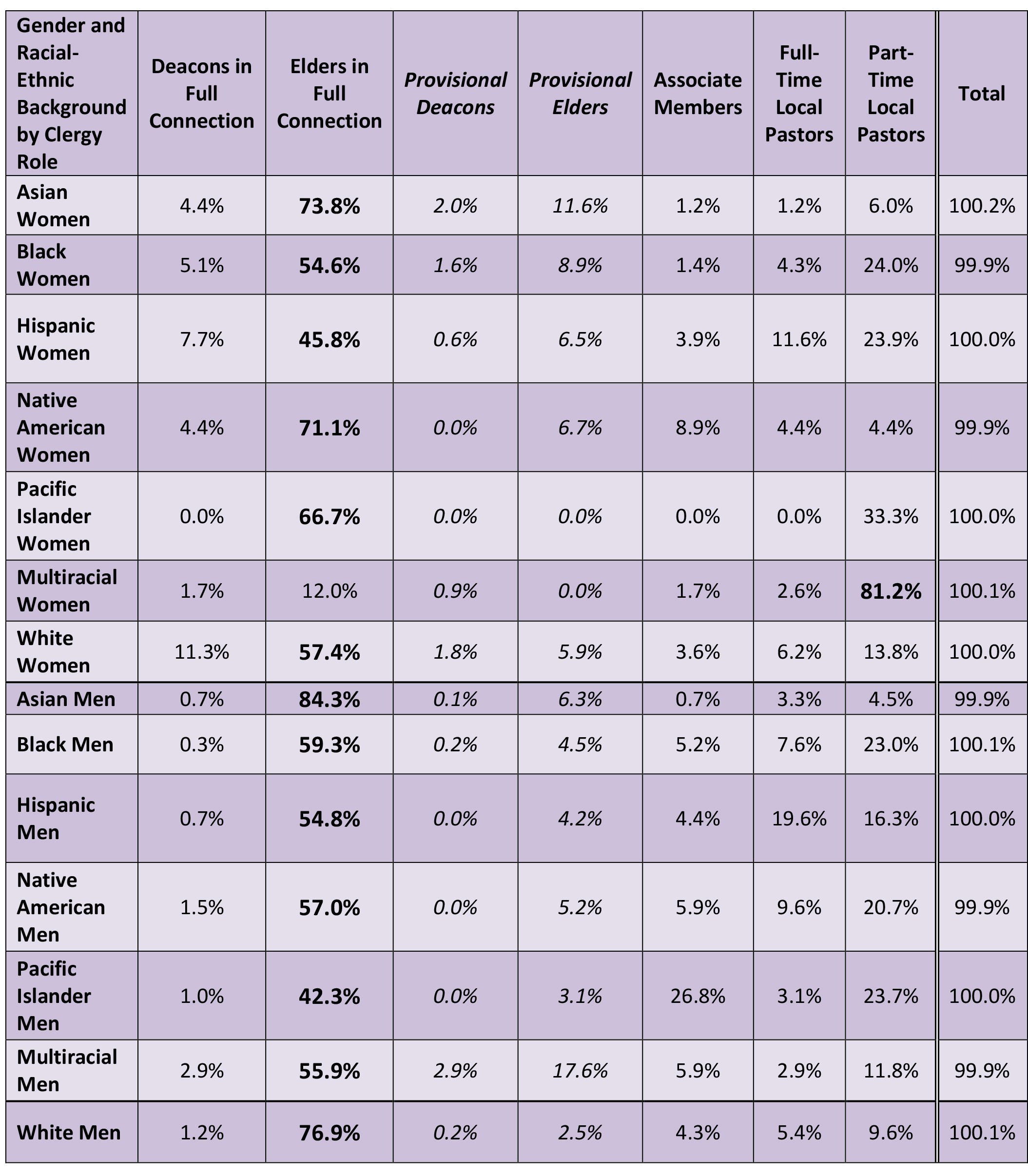 It is also worth noting that 51.4% of the entire U.S. make-up of The United Methodist ordained clergy are white men who are Elders in Full Connection (See Table 5).