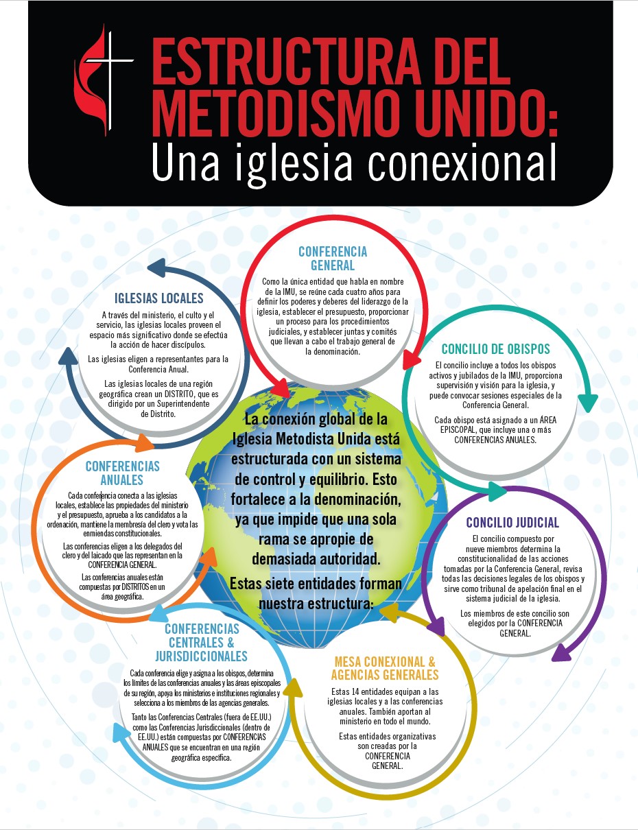 La infografía ilustra la conexión que une a las congregaciones locales en diversas configuraciones para convertirse en la denominación global conocida como La Iglesia Metodista Unida.