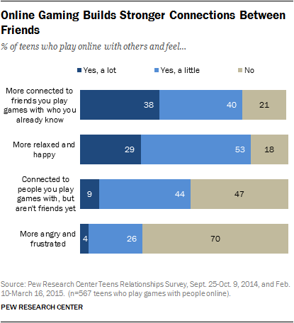 Una vez que se han conocido en el mundo real o en el digital, estos mismos dos canales (medios sociales y videojuegos) junto con los mensajes de texto son las plataformas principales para hacer crecer esas amistades. De hecho, el 72 por ciento de los adolescentes pasan tiempo con sus amigos en los medios sociales. Los videojuegos también atraen al 72 por ciento. Sin embargo, a diferencia de los medios sociales, los juegos abarcan el mundo real y el virtual, ya que el 82 por ciento dice que juega con otras personas en persona y el 75 por ciento dice que hace lo mismo con las personas en línea.