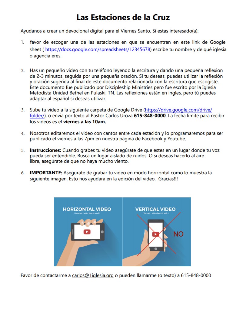 El vídeo que aparece arriba es un ejemplo de lo que puede ser esta idea virtual como producto final, proporcionado por La Primera Iglesia Metodista Hispana de Nashville, TN, EE.UU. Contacto: Rev. Carlos Uroza, carlos@1iglesia.org.
