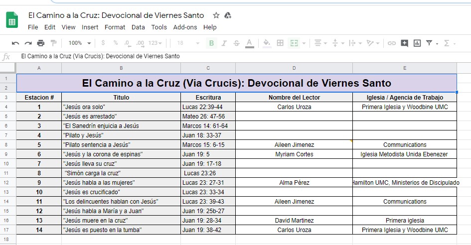 Cada persona que forme parte del video leerá un pasaje de la Biblia recordando el camino de Jesús hacia la cruz, lo grabará y se lo enviará al pastor. El pastor reunirá todos los clips y los pondrá juntos para hacer un video que será compartido con la congregación el Viernes Santo.