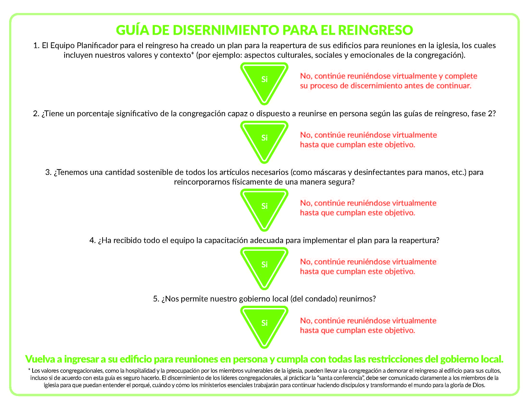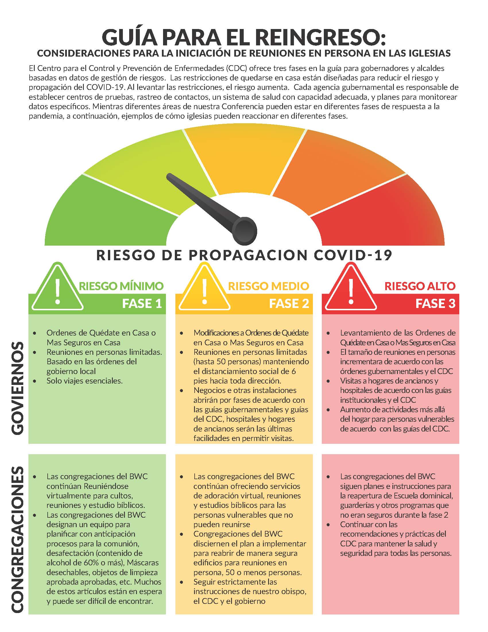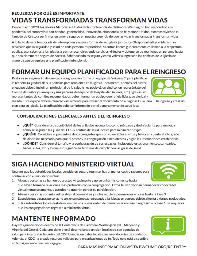 Los siguientes recursos han sido proporcionados por la Conferencia Anual de Baltimore Washington y presentan guías sobre cómo las iglesias deben reingresar al edificio. Por favor, revise las directrices de su conferencia anual y consulte con su superintendente de distrito sobre cómo abordar el reingreso si no está seguro/a.