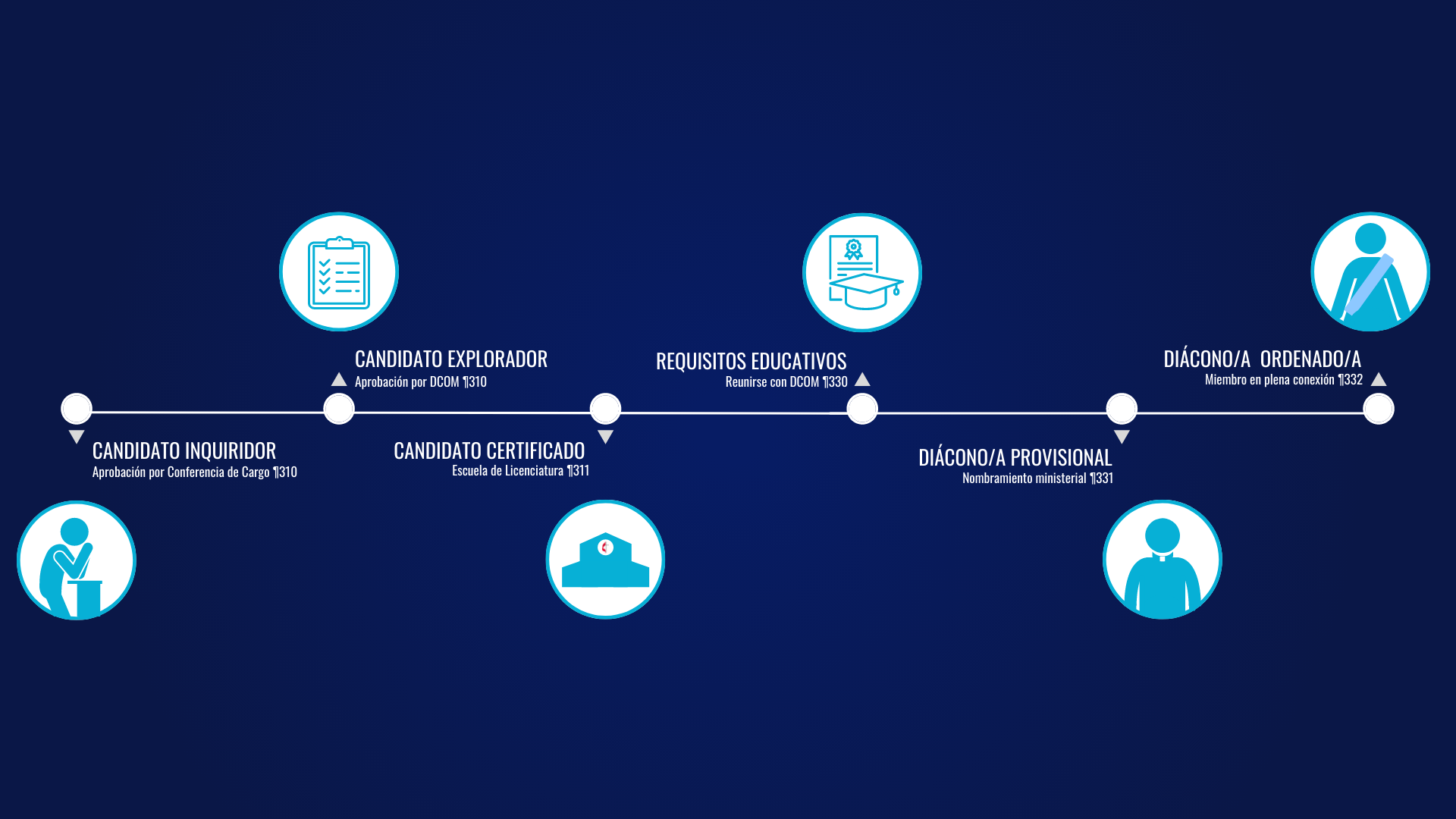 Los pasos descritos en este video son los estándares básicos establecidos por la Junta General de Educación Superior y Ministerio, que se pueden encontrar en los párrafos 310 - 314 y 328 - 331 del libro de Disciplina de la Iglesia Metodista Unida. Sin embargo, cada Conferencia Anual tiene la autoridad de requerir pasos adicionales para contextualizar su preparación y formación. Así que consulte a su pastor, pastora, superintendente de distrito, su mentor o la Junta del Ministerio Ordenado para asegurarse de que está cumpliendo con los requisitos de su conferencia.