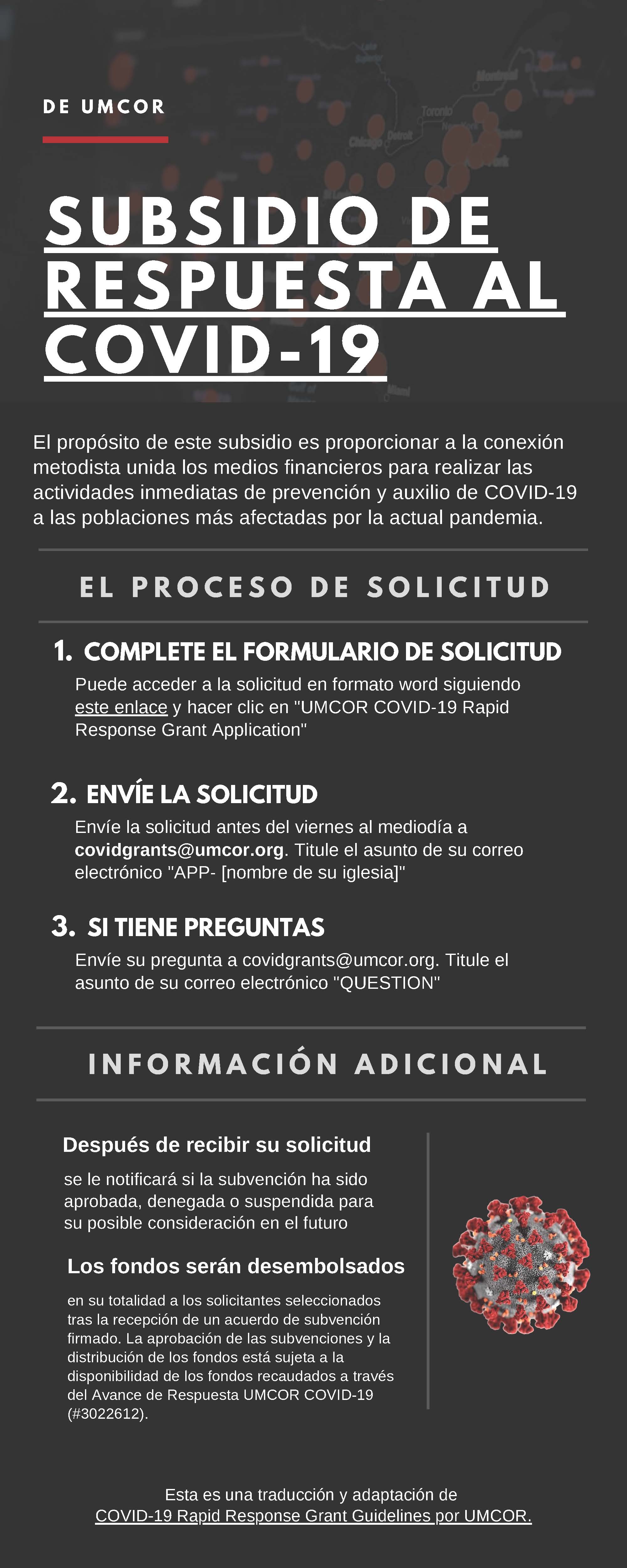 Las repercusiones de COVID-19 son de gran alcance y exigen una respuesta aún mayor. Incluso si uno se queda en casa, puede apoyar a los demás. A través del Fondo de Respuesta a COVID-19, el UMCOR otorgará subsidios para equipar a colaboradores que asistan a las poblaciones vulnerables de todo el mundo afectadas por COVID-19, incluidas las comunidades raciales/étnicas e indígenas de los Estados Unidos. Se concederán y desembolsarán subvenciones de hasta 20.000 dólares de manera rápida y eficaz para atender a las necesidades apremiantes en materia de salud, inseguridad alimentaria, agua, saneamiento e higiene e inestabilidad económica.
