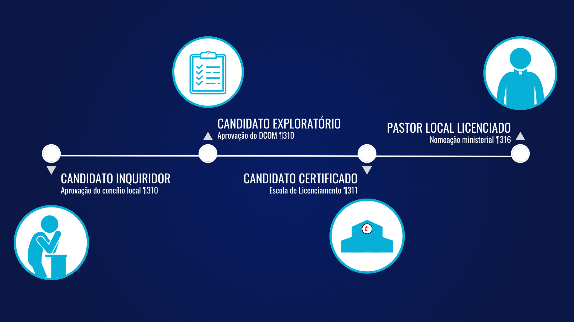 Os passos descritos neste vídeo são os padrões básicos estabelecidos pela Junta Geral de Ensino Superior e Ministério y podem ser encontradas no paragrafos 310 – 316 dos Canones. No entanto, cada conferência anual tem autoridade para exigir etapas adicionais. Portanto, certifique-se de verificar com seu pastor, DS ou mentor para garantir que você esteja atendendo aos requisitos da sua conferência.